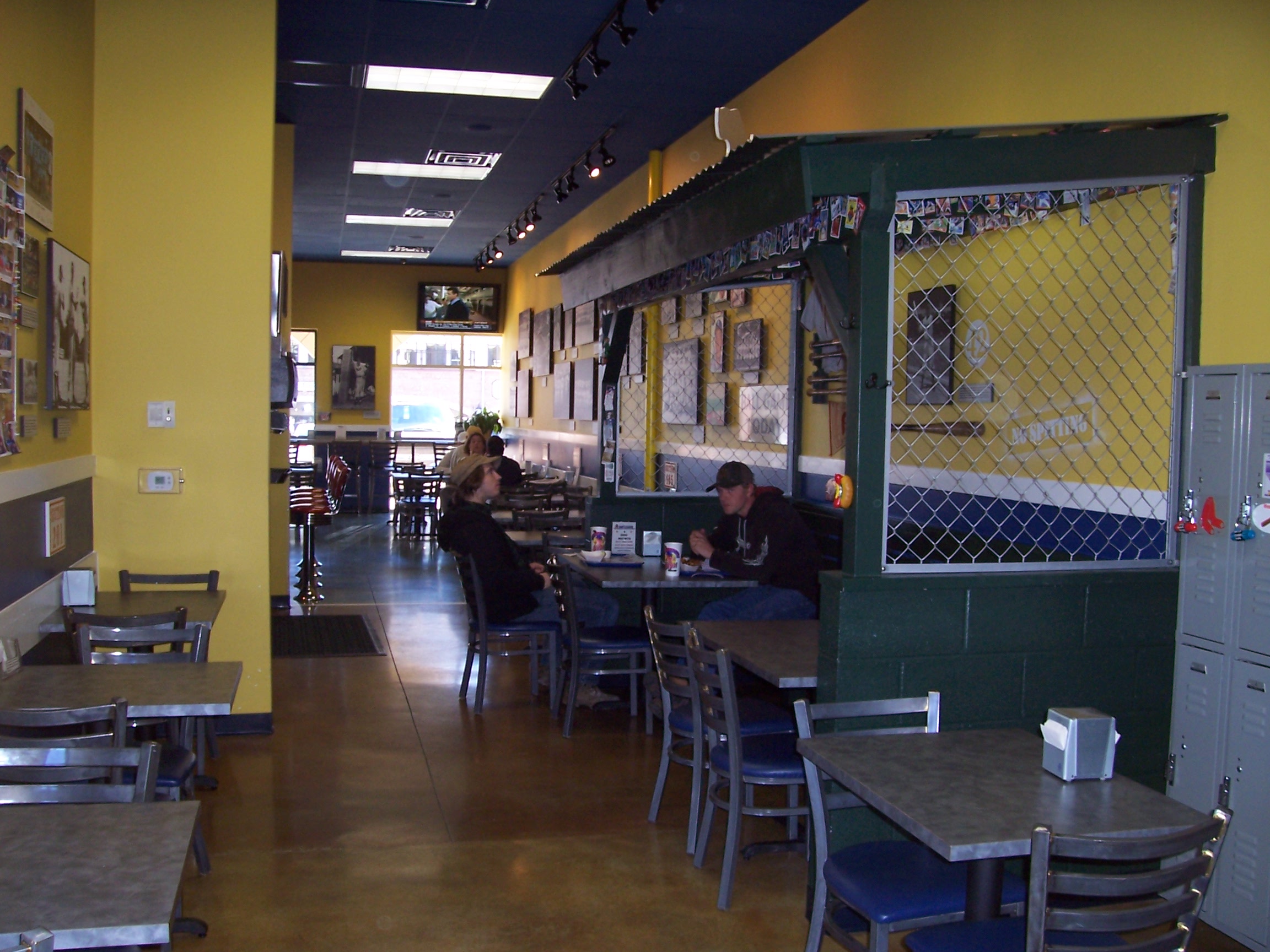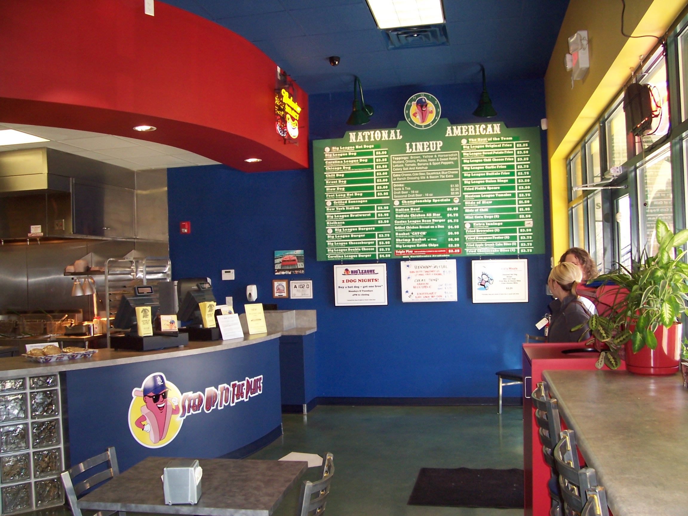 Adams + Associates Architecture was tasked by the owners of Big League Hot Dog to design a restaurant that would convey their love for baseball to their patrons. The resulting 2,000-square-foot establishment is a custom-designed replica of the original Wrigley Field scoreboard, which greets customers as they "step up to the plate" to place their orders. The restaurant is divided into distinct areas that simulate various aspects of the baseball experience, including counter box seats, locker room seats, outside bullpen seats, and a custom-designed dugout. This allows customers to await the arrival of their teammates in authentic stadium seating. With a nostalgic baseball setting and great American food, Big League provides an interactive experience that customers truly enjoy.