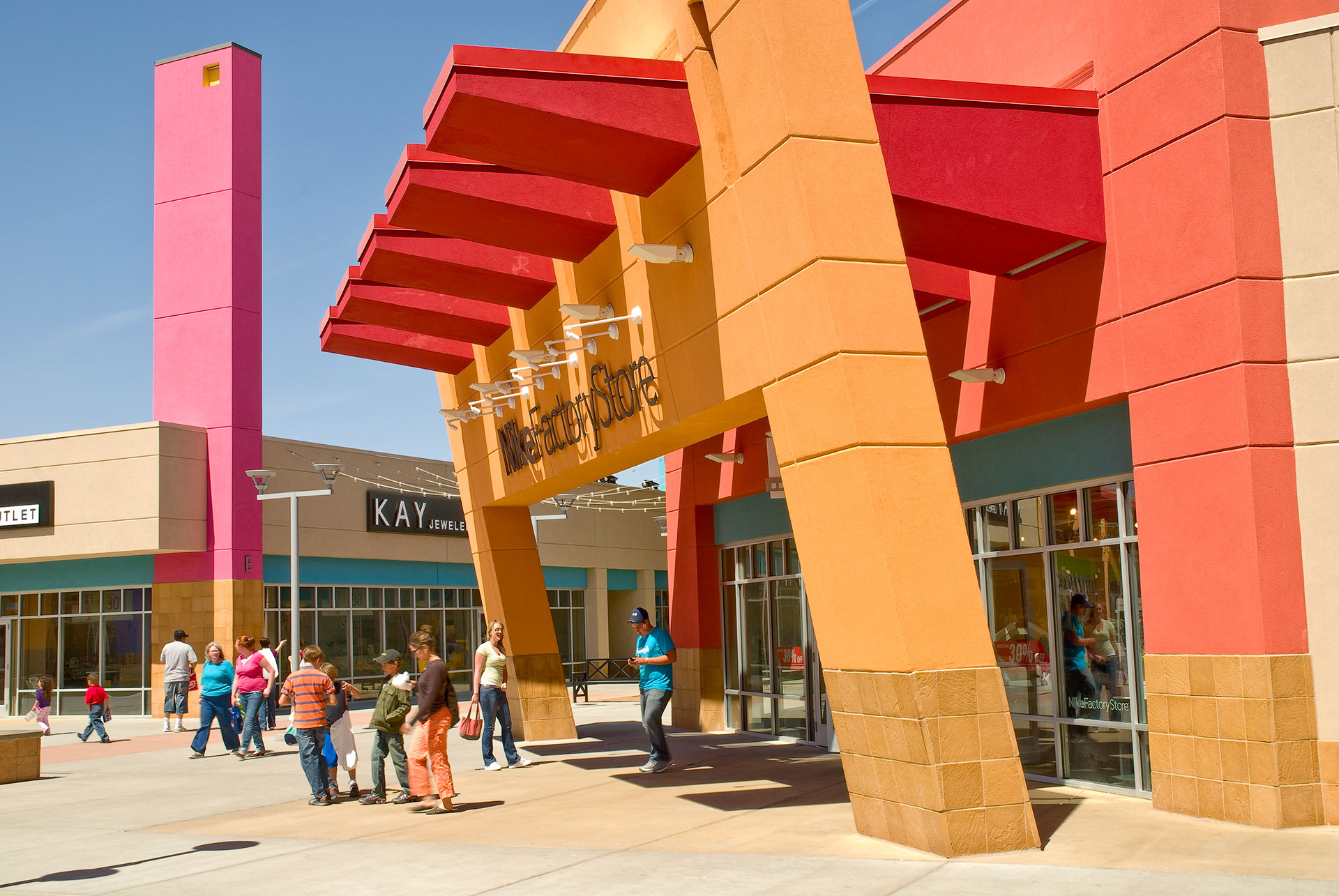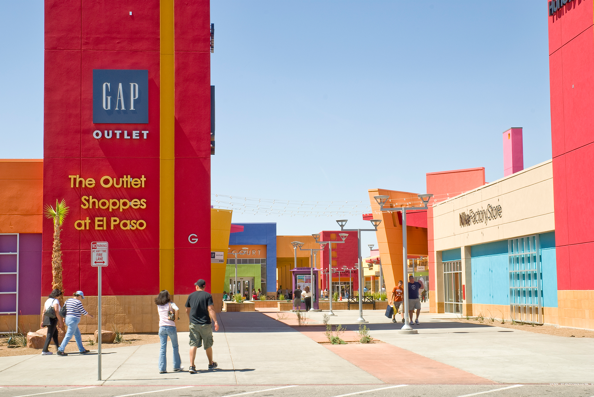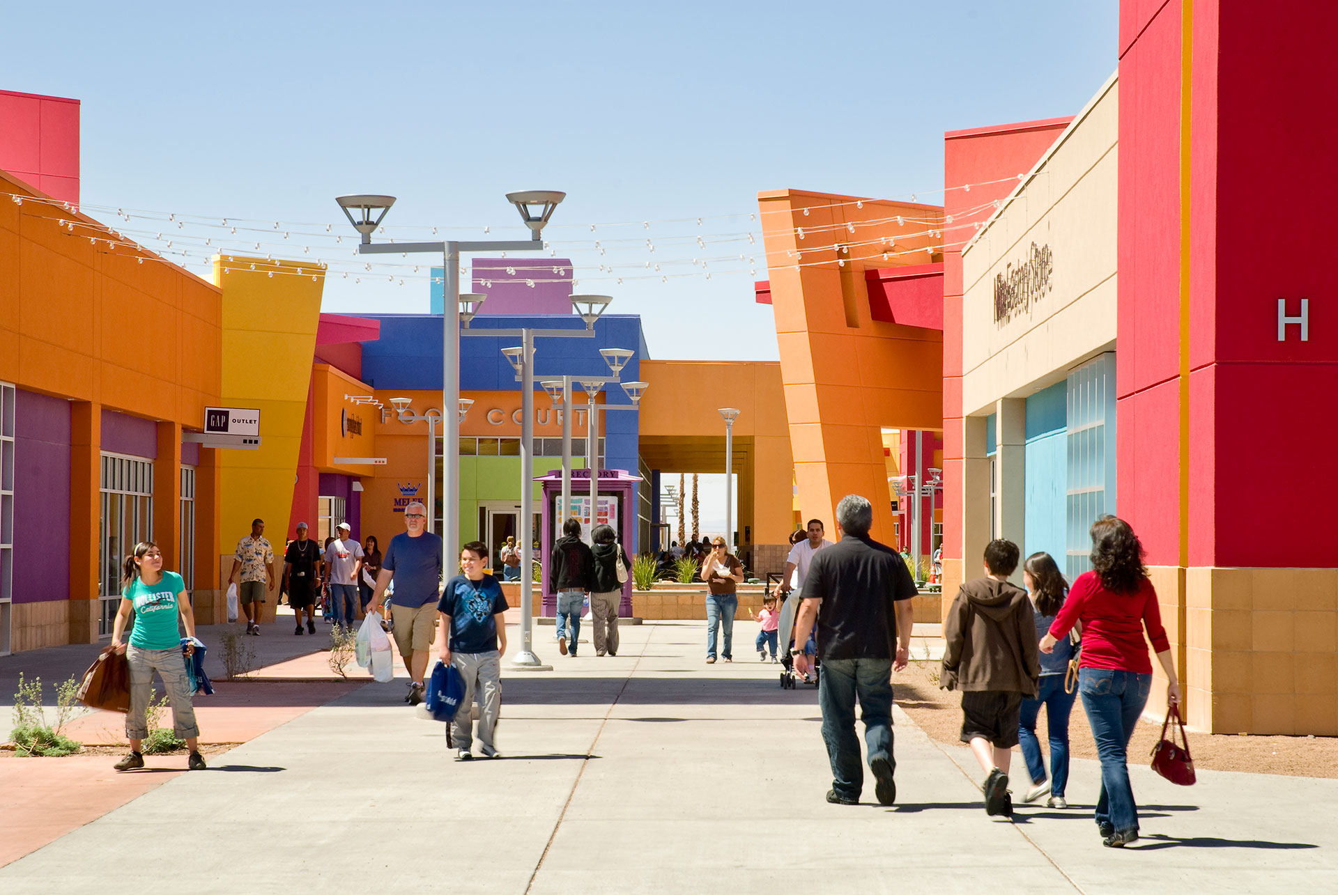 At a distance, the El Paso Outlets rise from the desert landscape like a mirage, its earthy tones and natural forms blending seamlessly with its surroundings. As you approach, the vibrant colors and clean geometry come into focus, creating a dance of light and shadow throughout the day. At night, the space is transformed, with dramatic lighting patterns illuminating the complex. Large roofs span across open galleries between buildings providing shade for shoppers, while interactive fountains provide evaporative cooling for the surrounding courtyards. The central food court is a hub of activity, providing outdoor seating areas shaded by a trellis and a place for rest. With over ninety stores, the Outlet Shoppes at El Paso has become a prime destination for shoppers and businesses.