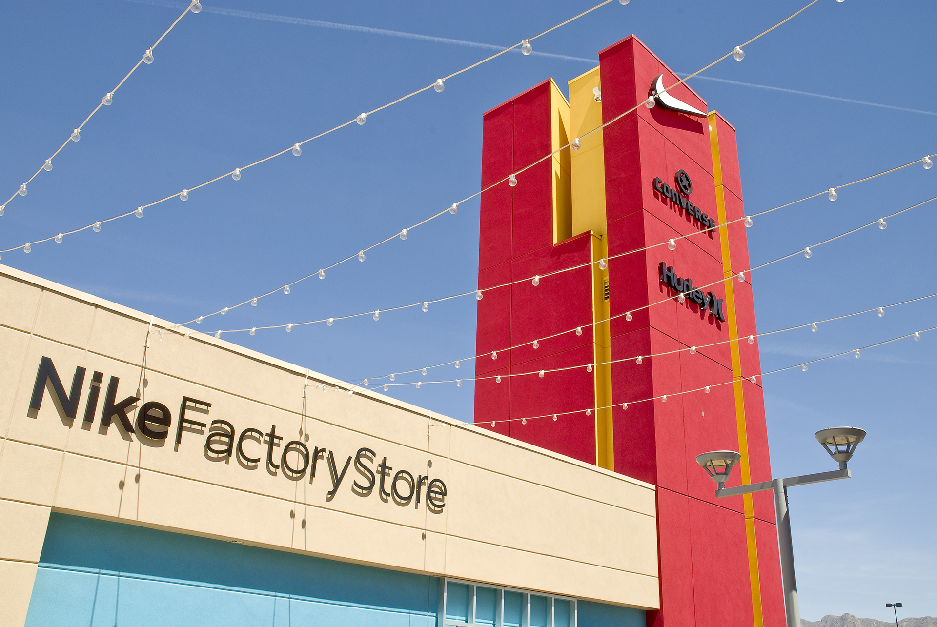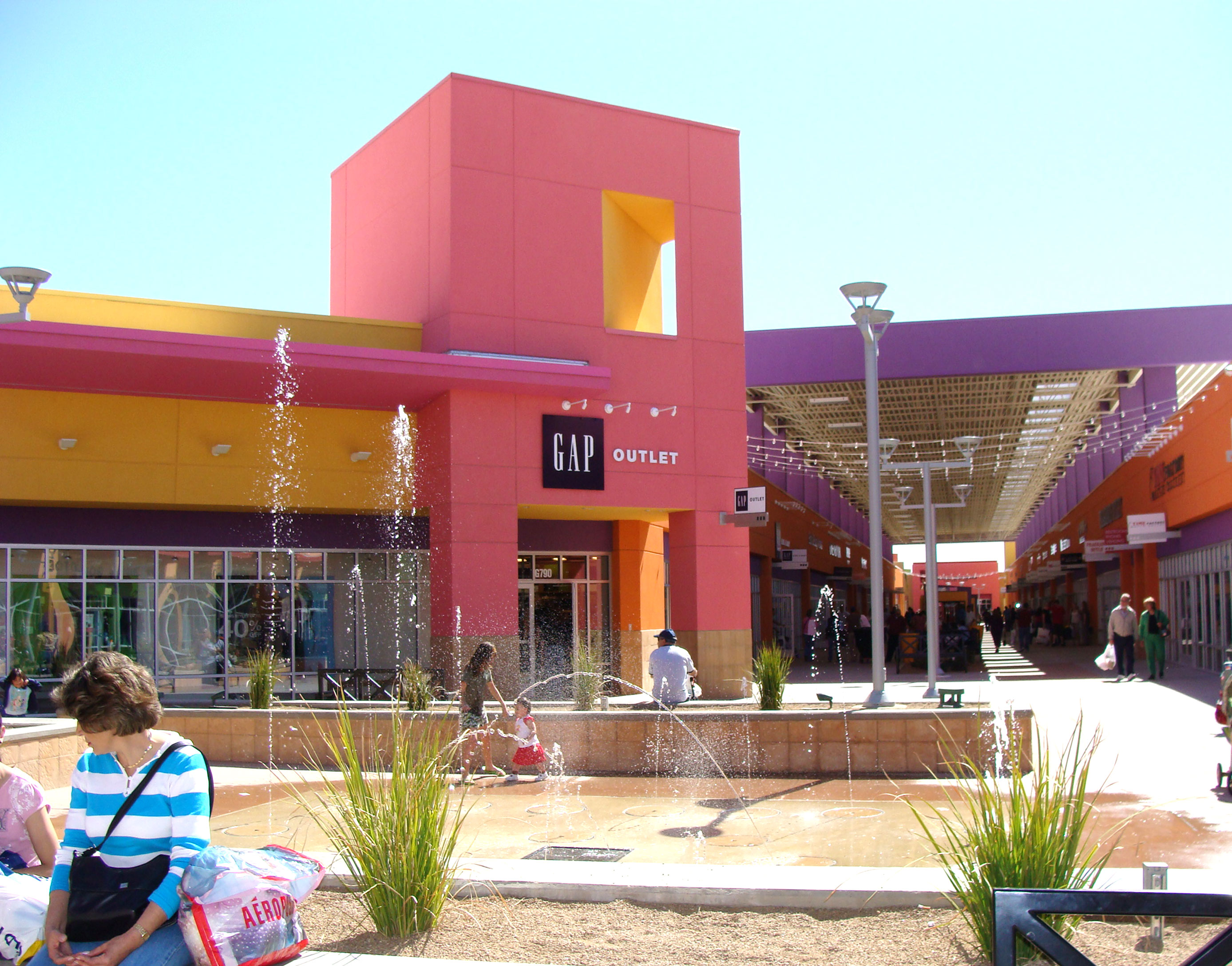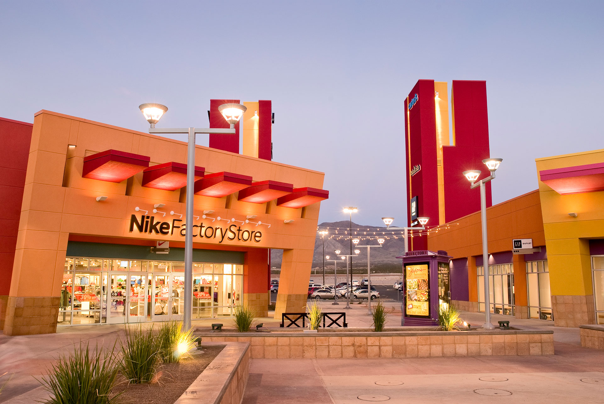 At a distance, the El Paso Outlets rise from the desert landscape like a mirage, its earthy tones and natural forms blending seamlessly with its surroundings. As you approach, the vibrant colors and clean geometry come into focus, creating a dance of light and shadow throughout the day. At night, the space is transformed, with dramatic lighting patterns illuminating the complex. Large roofs span across open galleries between buildings providing shade for shoppers, while interactive fountains provide evaporative cooling for the surrounding courtyards. The central food court is a hub of activity, providing outdoor seating areas shaded by a trellis and a place for rest. With over ninety stores, the Outlet Shoppes at El Paso has become a prime destination for shoppers and businesses.