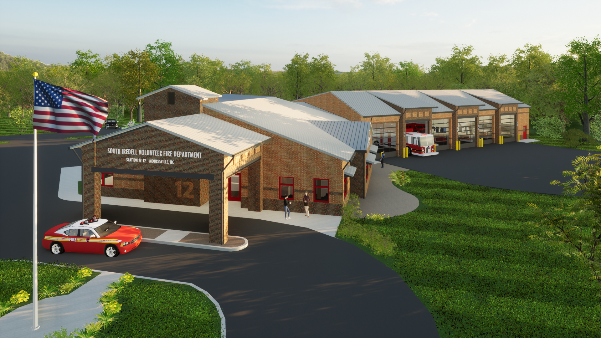 Our firm collaborated with the South Iredell Volunteer Department and its building committee to design the Mooresville Fire Station #12, providing the initial program and design concept. The L-shaped footprint of the building divides into two primary zones, with office, administration, and living quarters on one end and the apparatus bays on the other. Upon entering the site, a porte-cochere leads visitors and staff to the administration. A prominent feature of the design is the syncopation of the roof plane along the apparatus bay. The use of red and grey accents throughout the building aligns with the department's branding.