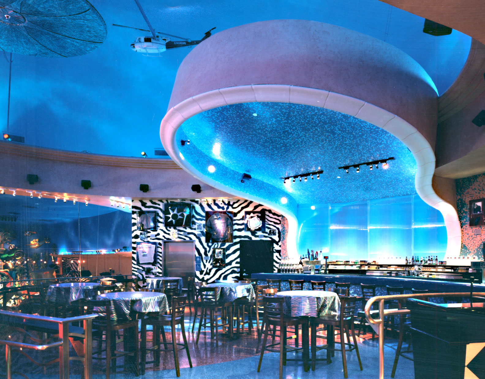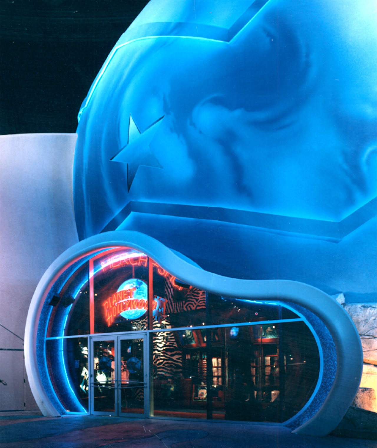 The architecture of Planet Hollywood is characterized by a "Hollywood hip" theme that departs from the Art Deco style typically associated with Hollywood-themed venues. Instead, it features a modern and sleek aesthetic that incorporates a generous use of bold colors, neon, and reflective surfaces. This design creates a dynamic and high-energy atmosphere, meant to evoke the excitement and glamour of Hollywood. The Myrtle Beach, South Carolina location of Planet Hollywood opened in 1996, and its architecture was intended to appeal to a young and stylish demographic seeking an exciting and fashionable experience.
